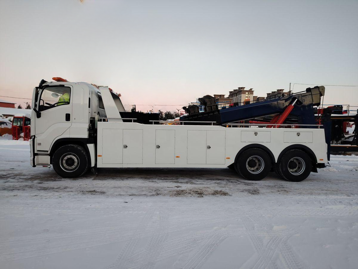 Эвакуатор ISUZU QL5350TQZRX6 8×4, с двигателем 6WG1-TCG61 (460 л.с.). Оснащён стрелой 15 т, двумя лебёдками и гидравлическими опорами. Надёжная техника для эвакуации тяжёлого транспорта.
